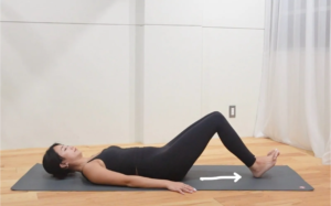 ②膝を曲げたまま、息を吐きながら脚を下ろし、かかとを床の遠くの方にタッチします。この時に腰が反らないようにしっかりとお腹を床の方へ引き込んでおきましょう。息を吸いながらゆっくりと骨盤の真上に膝がくる位置に戻し、再びかかとを床にタッチします。この動きを呼吸とともに繰り返しましょう。