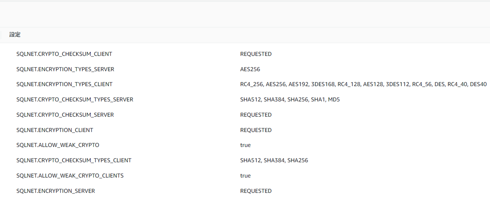 SQLNET.ENcRYPTIONgTYPES_CLIENT@RC4_256, AES256, AES1 92, 3DES1 68, RC4=1 28, AES1 28, 3DES1 1 2, RC4_56, DES, RC4_40, DES40